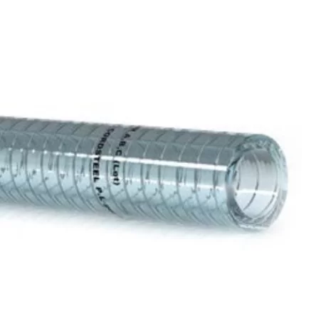 Flexibel PVC-slang med inbyggd stålspiral. Lämplig för transport av havsvatten, inaktiva vätskor och livsmedelsvätskor i enlighet med EU 10/2011 SIM A, B, C.